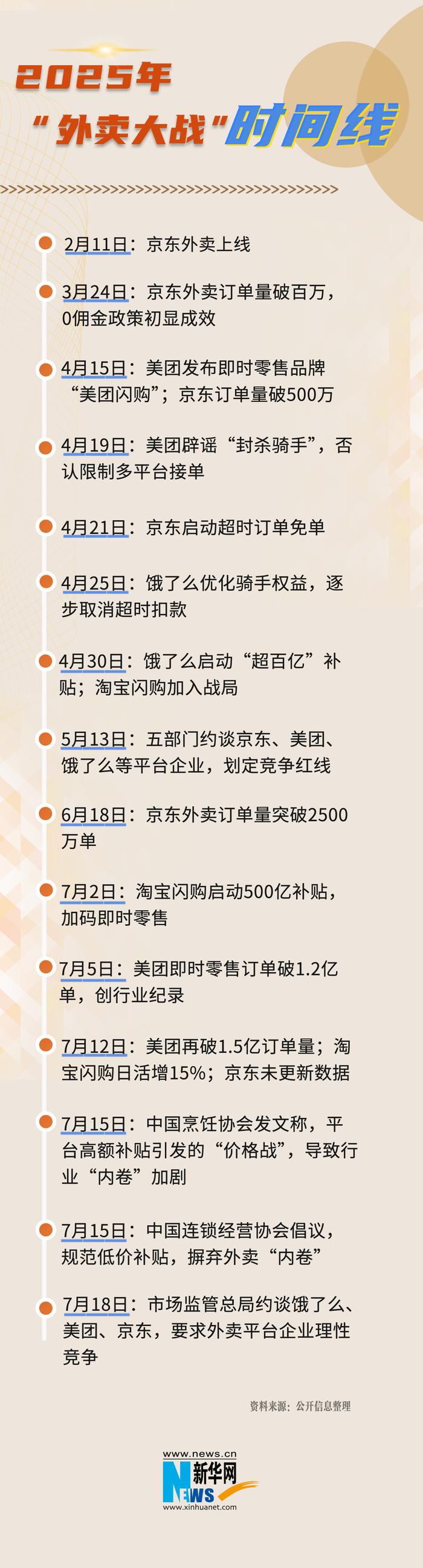 7月18日,市场监管总局约谈饿了么、美团、京东三家平台企业,要求相关平台企业严格遵守《中华人民共和国电子商务法》《中华人民共和国反不正当竞争法》《中华人民共和国食品安全法》等法律法规规定,严格落实主体责任,进一步规范促销行为,理性参与竞争,共同构建消费者、商家、外卖骑手和平台企业等多方共赢的良好生态,促进餐饮服务行业规范健康持续发展。