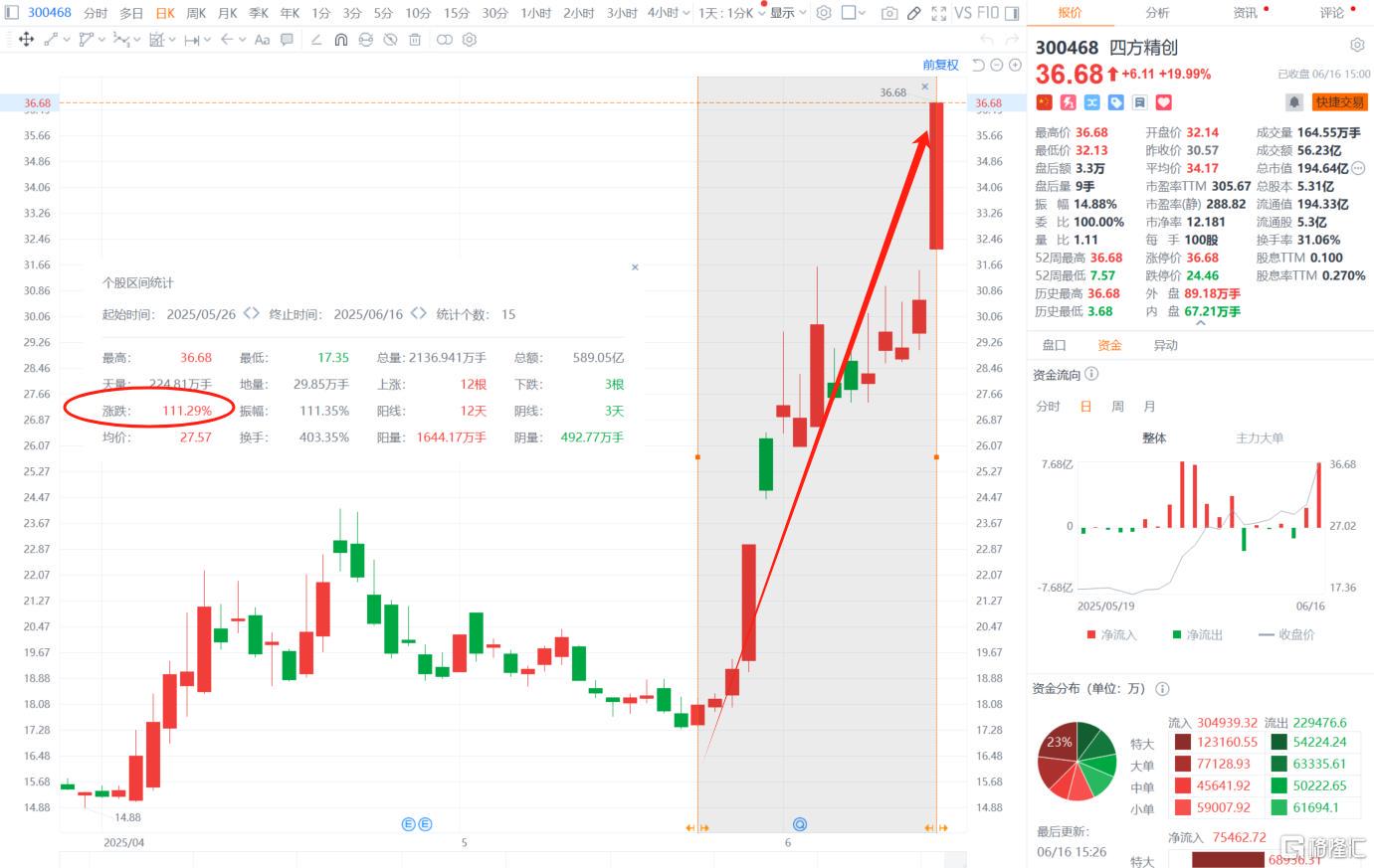 自5月下旬以来,四方精创股价持续上扬,近15个交易日累计涨幅已超110%。